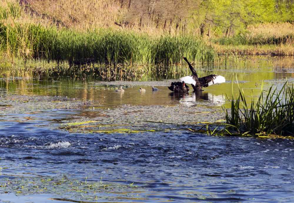黑天鵝與小天鵝在水中自由遊弋。