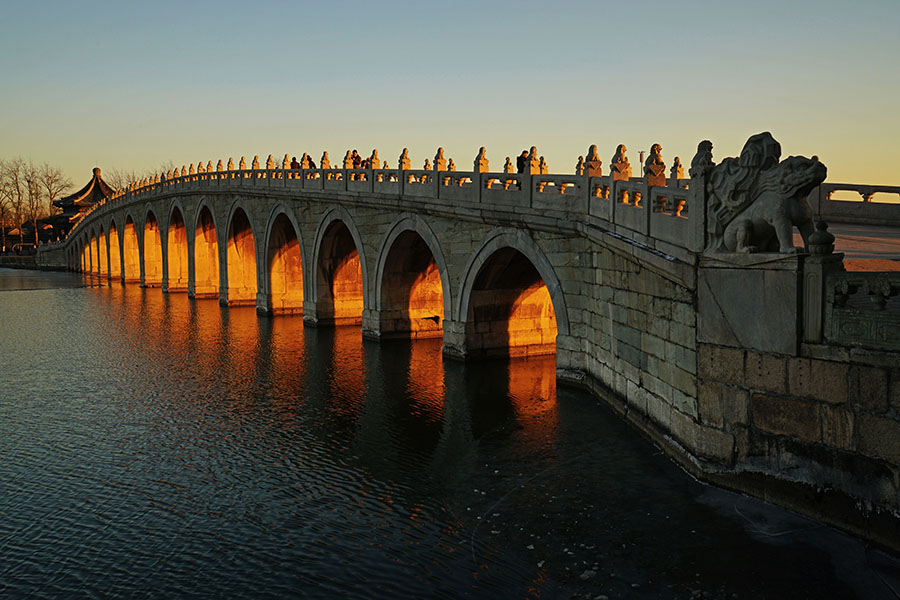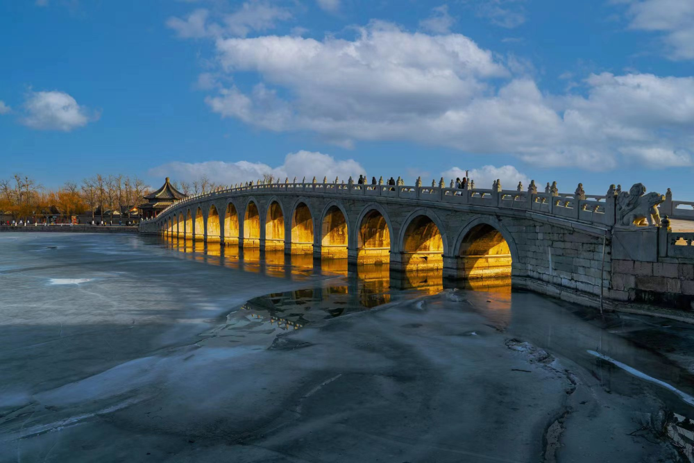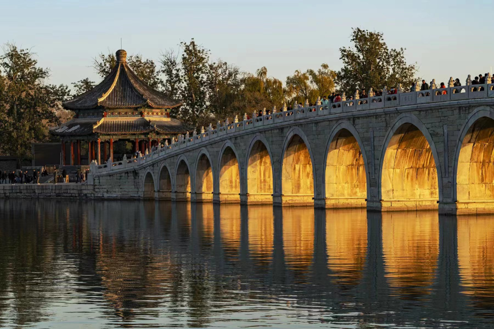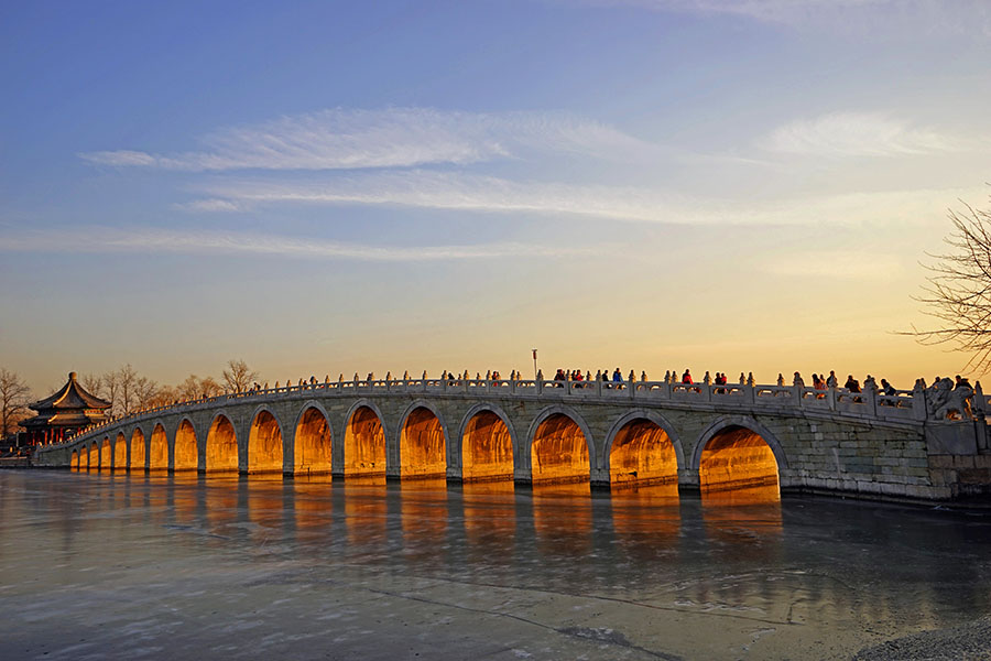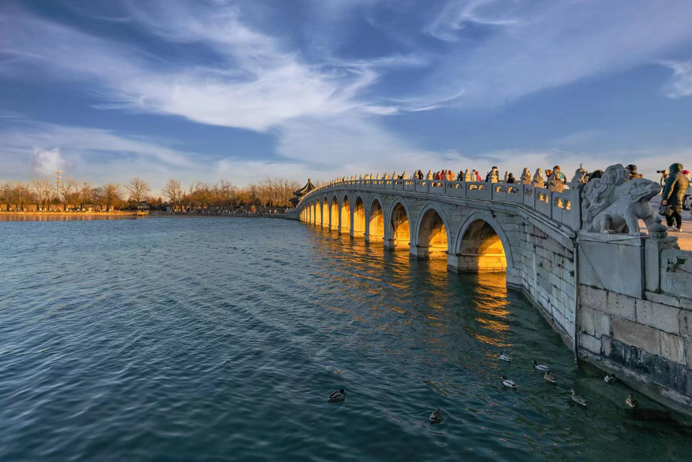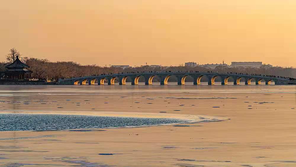 頤和園十七孔橋,每年冬至節氣前後,都會被落日的餘光照亮,上演一場“紅光穿洞”的視覺盛宴。