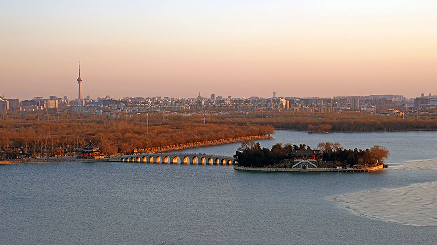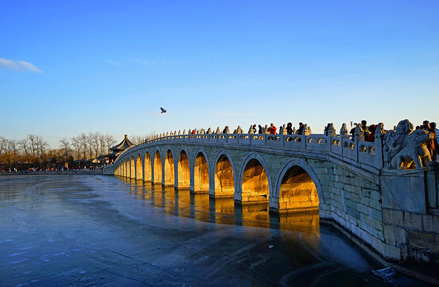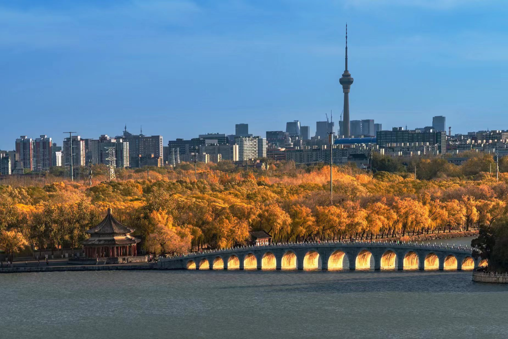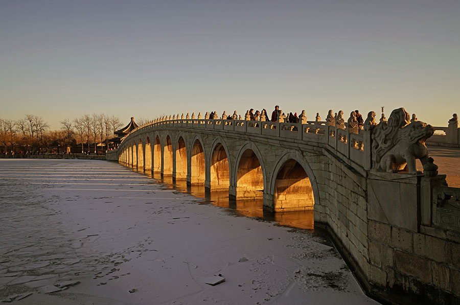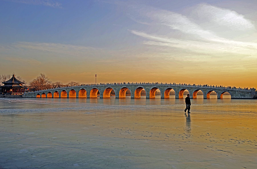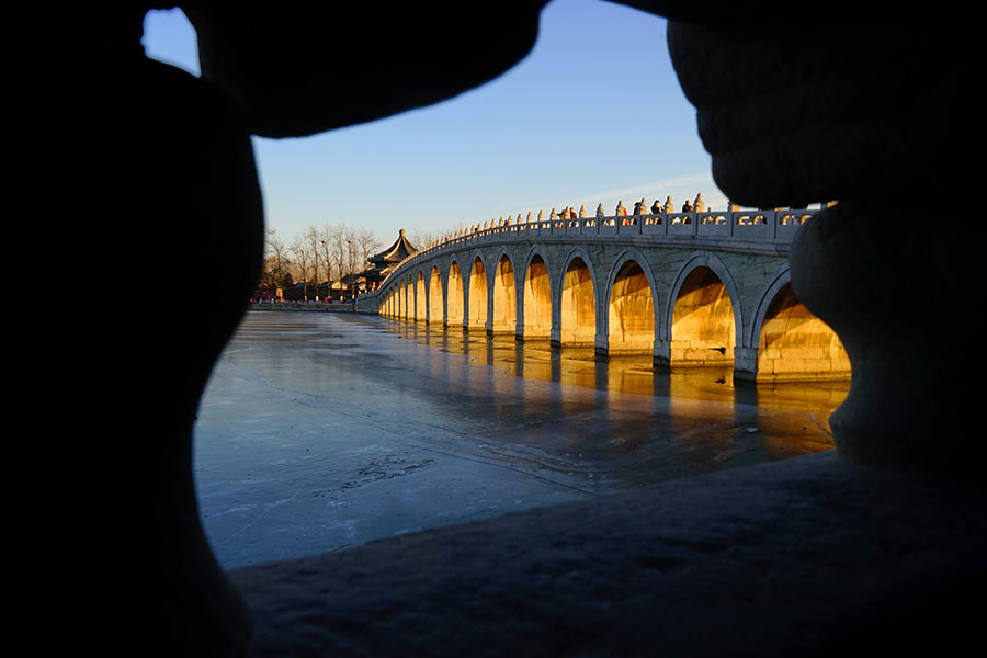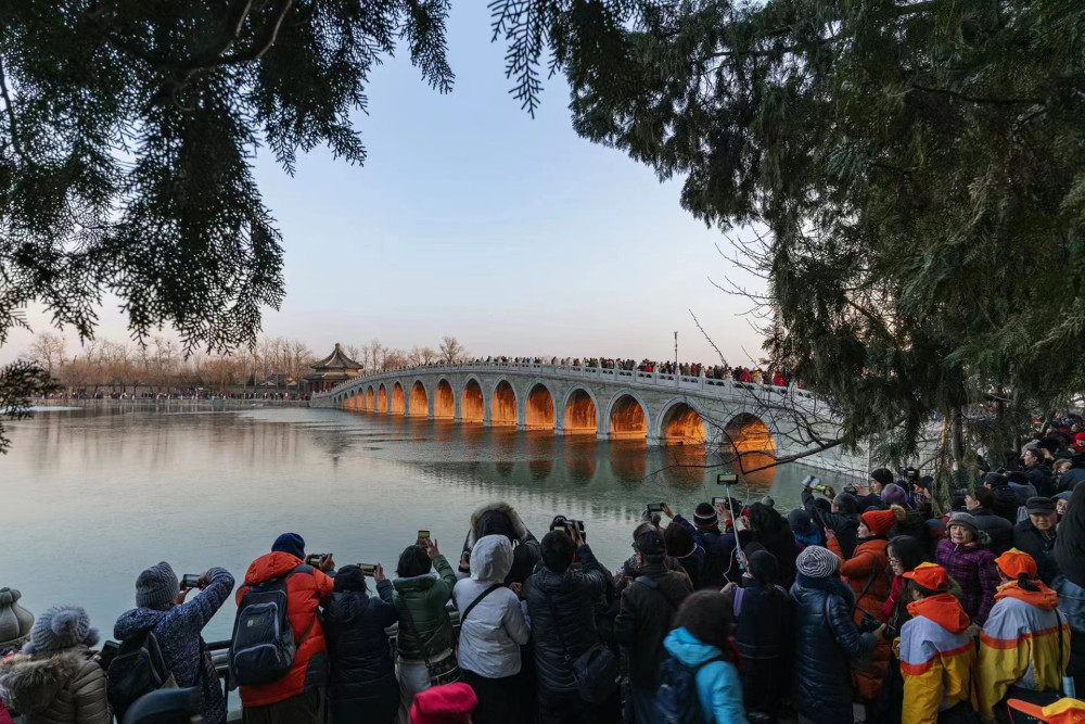 頤和園十七孔橋,每年冬至節氣前後,都會被落日的餘光照亮,上演一場“紅光穿洞”的視覺盛宴。