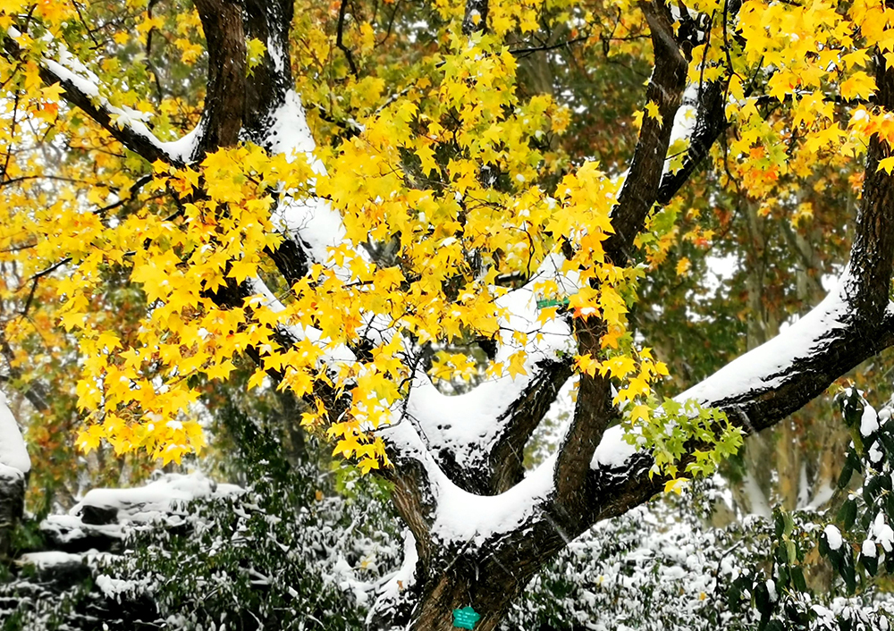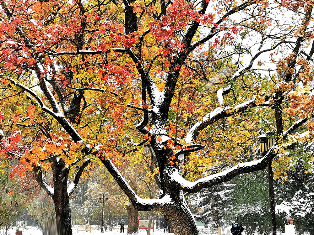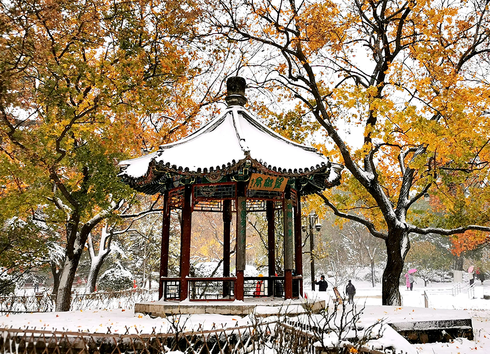北京2021年冬天第一場雪早早降臨,秋天還沒結束,冬天已經到來。地壇公園裏紅色黃色的秋葉,在白雪映襯下,更顯鮮豔奪目,美不勝收。
