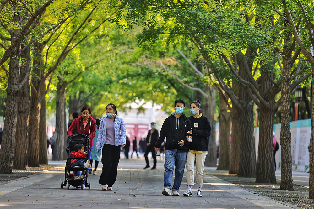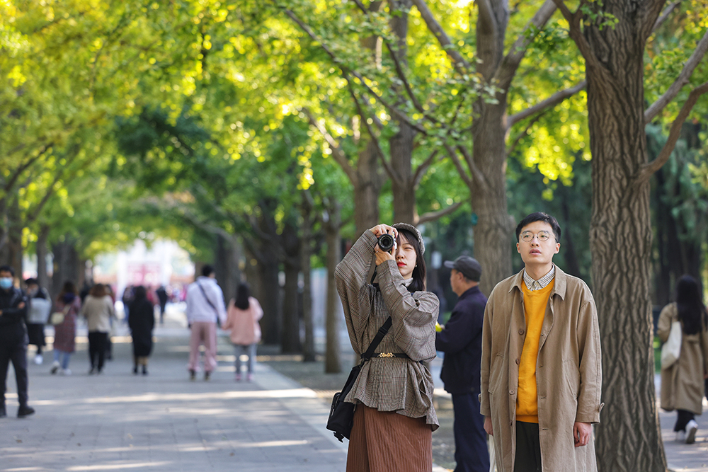 金秋時節,隨著氣溫降低,地壇公園的銀杏葉逐漸變黃,公園裏的銀杏大道一片金黃,秋色迷人,成了秋天裏的一道風景,吸引眾多遊客前來參觀。