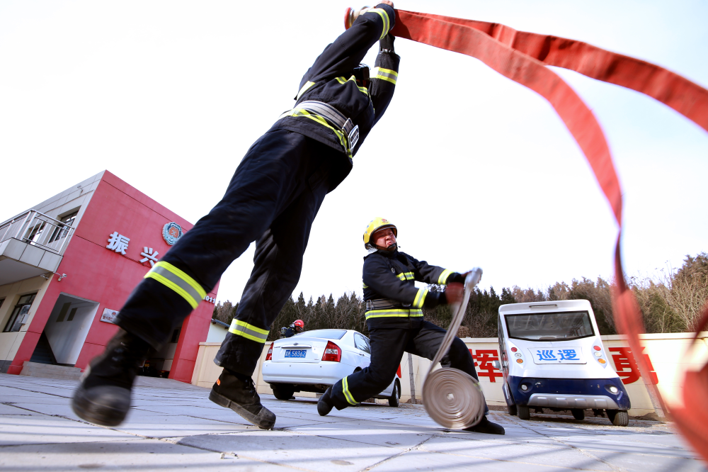 破拆障礙、水槍掩護、攀爬繩索,消防員進行縱深滅火救人操訓練。(來源:大興區消防救援支隊)