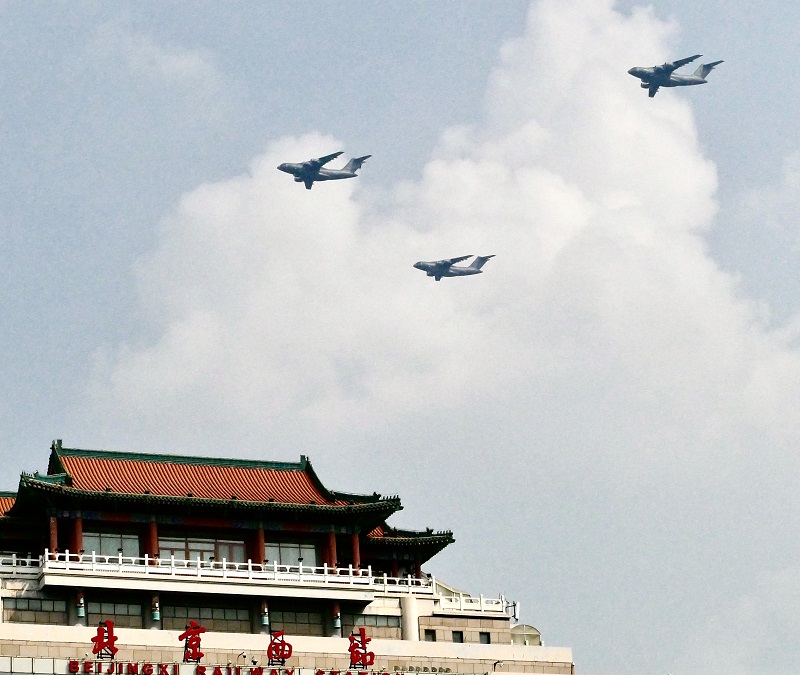 9月3日上午,紀念中國人民抗日戰爭暨世界反法西斯戰爭勝利80周年大會在北京天安門廣場隆重舉行。閱兵空中梯隊劃過北京上空,與北京地標建築留下絕美同框時刻。(攝影:王金棟)