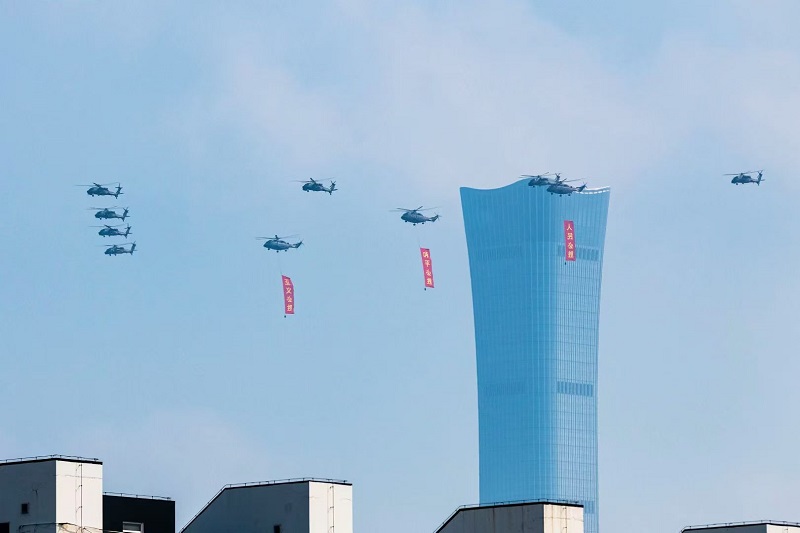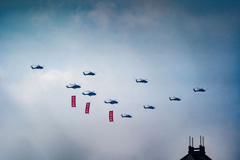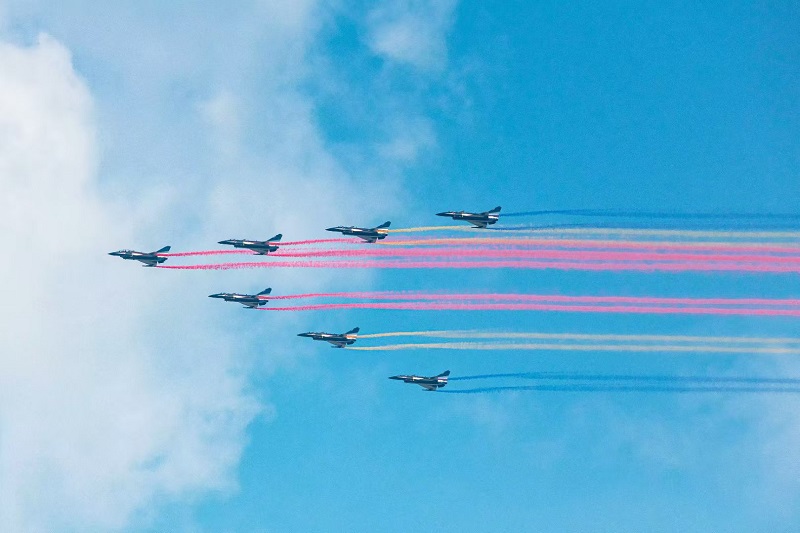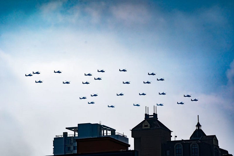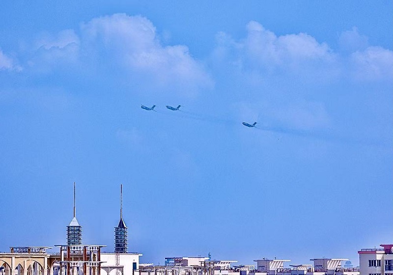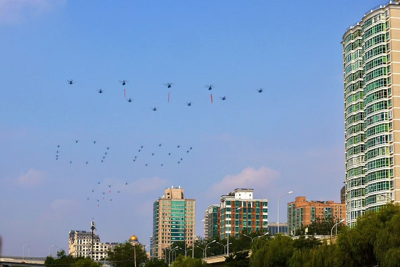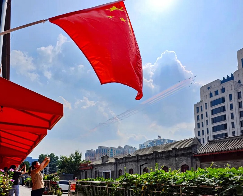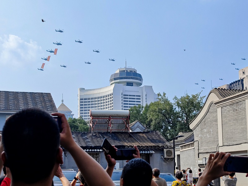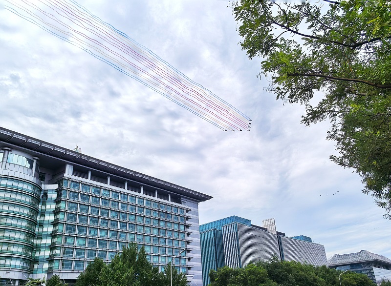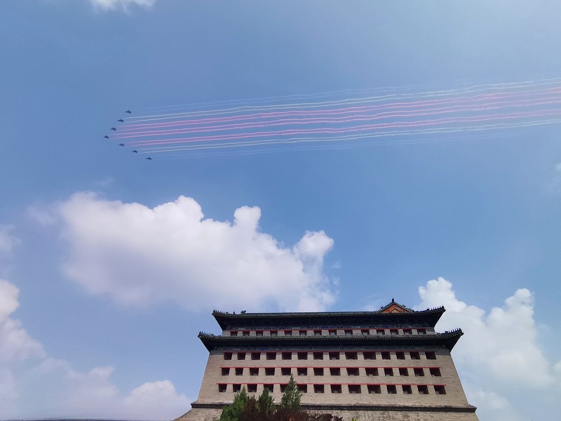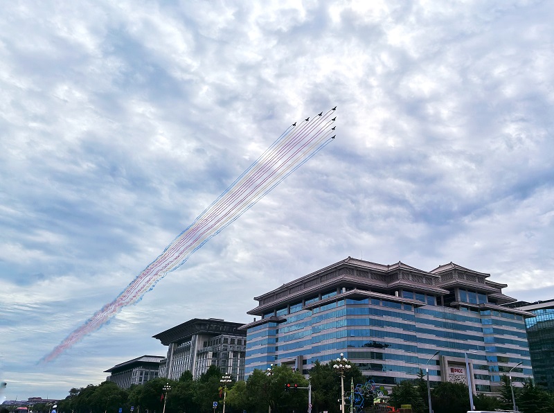 9月3日上午,紀念中國人民抗日戰爭暨世界反法西斯戰爭勝利80周年大會在北京天安門廣場隆重舉行。閱兵空中梯隊劃過北京上空,與北京地標建築留下絕美同框時刻。(攝影:姚詠梅)