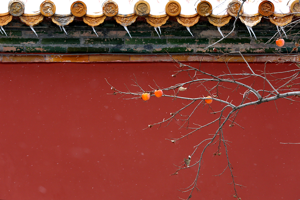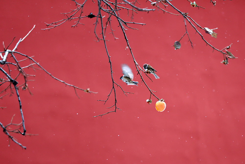 故宮的柿子熟了,引來麻雀登上枝頭,給故宮帶來了一份趣味與生機。