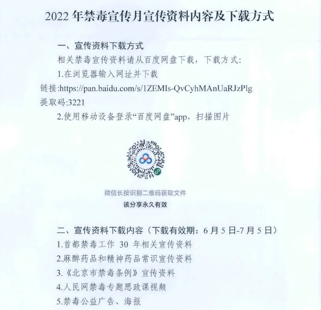 為廣泛傳播“健康人生、綠色無毒”理念,以實際行動迎接黨的二十大勝利召開,市禁毒委定於2022年6月期間,按照疫情防控和維護首都安全穩定的各項工作要求,采取線上為主的形式,在全市範圍內開展“全民禁毒宣傳月”係列活動。現將有關宣傳資料電子版附上(見附件),請掃描二維碼下載學習,並積極訂閱“中國禁毒”、“北京禁毒”微博、微信公眾號,了解毒品知識、毒品危害及防毒技巧,切實提高禁毒意識。