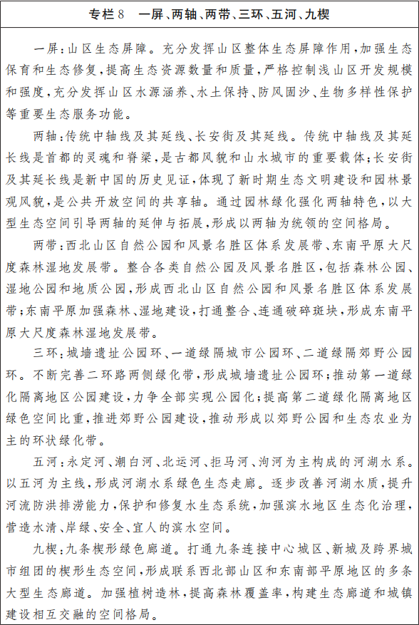 建設寧靜宜居的花園式核心區。優化長安街、中軸線沿線綠地景觀,塑造展現國家禮儀、大國首都文化自信的景觀形象。傳承古都風韻,保護完善老城六海八水的空間格局,結合二環內曆史水係恢複和濱水環境建設實施濱水綠化,建設口袋公園及小微綠地50處。完善“凸”字形城廓遺址公園環,形成連續且具有一定寬度的環二環景觀帶,打造平安大街、西單北大街一線、東單北大街一線、兩廣路沿線綠蔭空間,建設林蔭大道50處。提高公共綠色空間規模與品質,積極倡導各類院落開展內部環境整治和“開牆透綠”,種好“院中一棵樹”,與市民共享更多綠色空間。