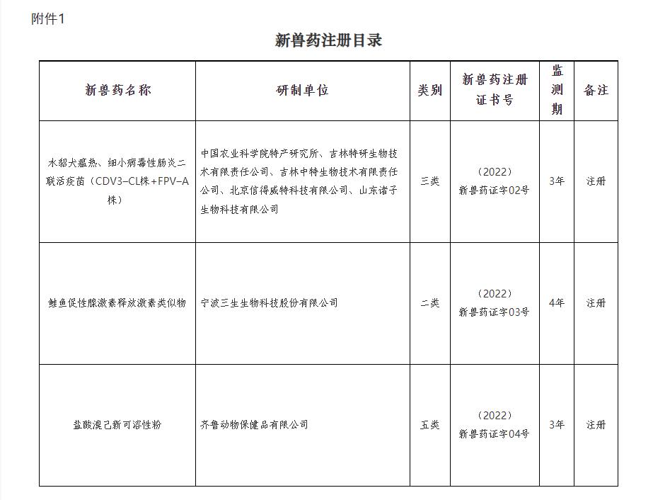 根據《獸藥管理條例》和《獸藥注冊辦法》規定,經審查,批準中國農業科學院特產研究所等7家單位申報的水貂犬瘟熱、細小病毒性腸炎二聯活疫苗(CDV3–CL株+FPV–A株)等3種獸藥產品為新獸藥,核發《新獸藥注冊證書》,發布產品工藝規程、質量標準、說明書和標簽,自發布之日起執行。