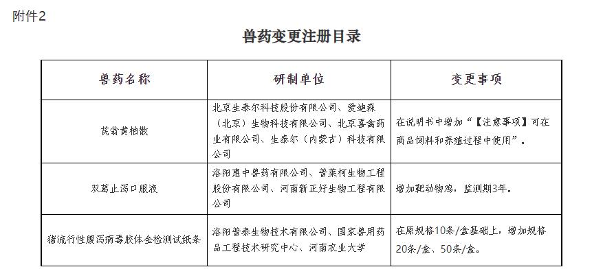 批準洛陽惠中獸藥有限公司等3家單位申報的雙葛止瀉口服液變更注冊,發布修訂後的工藝規程、質量標準、說明書和標簽,自發布之日起執行。新增靶動物雞,監測期3年。
