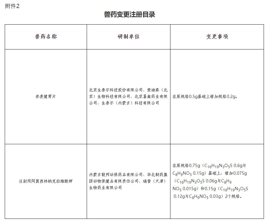 批準北京生泰爾科技股份有限公司等7家單位申報的參麥健胃片等2種獸藥產品變更注冊,自發布之日起執行。